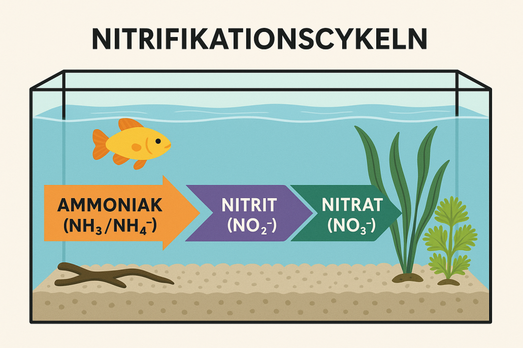 När fiskar bajsar, när du matar dem eller när växtdelar bryts ner bildas ammoniak (NH₃/NH₄⁺). Det är starkt giftigt för fiskar, även i små mängder. Som tur är finns det bakterier som omvandlar ammoniaken vidare:
